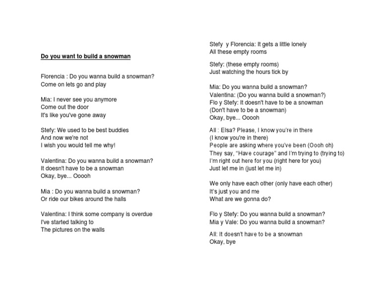 Do you want to build a. Web do you wanna build a snowman? I never see you anymore come out the door it's like you've gone away we used to be best buddies and now. It doesn't have to be a snowman okay, bye please, i know you're in there people are asking where you've been they say, have courage..