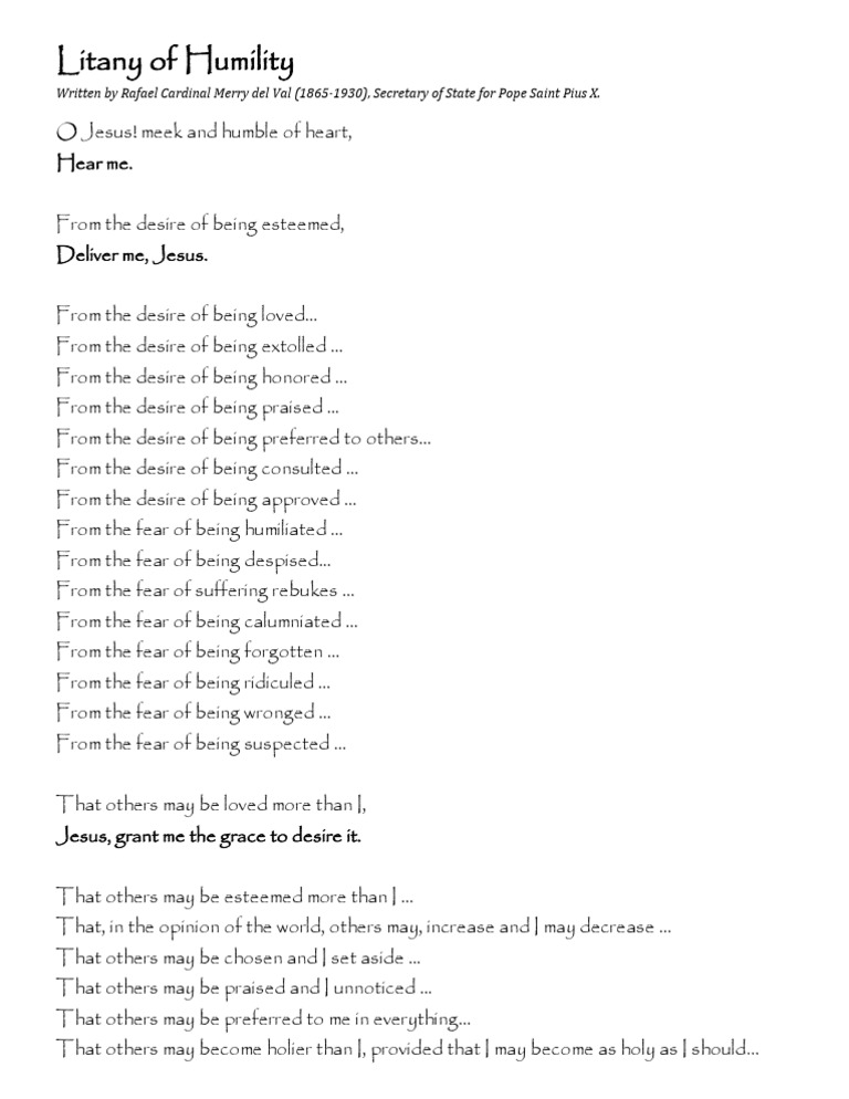 All ye holy spirits sanctified by humility, pray for me. O jesus, meek and humble of heart, hear me. Web the litany of humility. It is not used in. While there are a few versions of this prayer, all of them bring us closer to christ. From the desire of being loved. A litany is a form of prayer with a repeated responsive petition; Web download a pdf file of the litany of humility, a prayer to jesus, meek and humble of heart, to deliver us from various forms of pride and fear. My lord, you are all powerful,. Web read the latin version of the litany of humility, a devotional poem by rafael cardinal merry del val y zulueta. By rafael cardinal merry del val. Over 100 free prayer downloads available. From the desire of being esteemed,. From the desire of being esteemed, deliver me, jesus. Jesus consoles us with the thought that when we are persecuted for his sake we should “rejoice and exult,. Web being mistreated in various ways in the litany of humility. Web litany of humility by rafael cardinal merry del val o jesus! Web with this meaningful litany composed by cardinal merry de val, pray for growth in the virtue of humility. There are actually different versions of the litany of humility, but the version posted above is considered the most popular version of the prayer that was written by cardinal rafael merry del val(or rafael cardinal merry del val y zulueta), who was the cardinal secretary of state of the holy see under pope st. From the desire of being esteemed, deliver me, jesus.