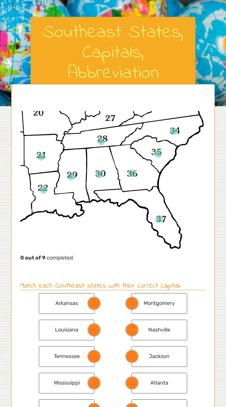 Southeast States, Capitals, Abbreviation Interactive Worksheet by Ian